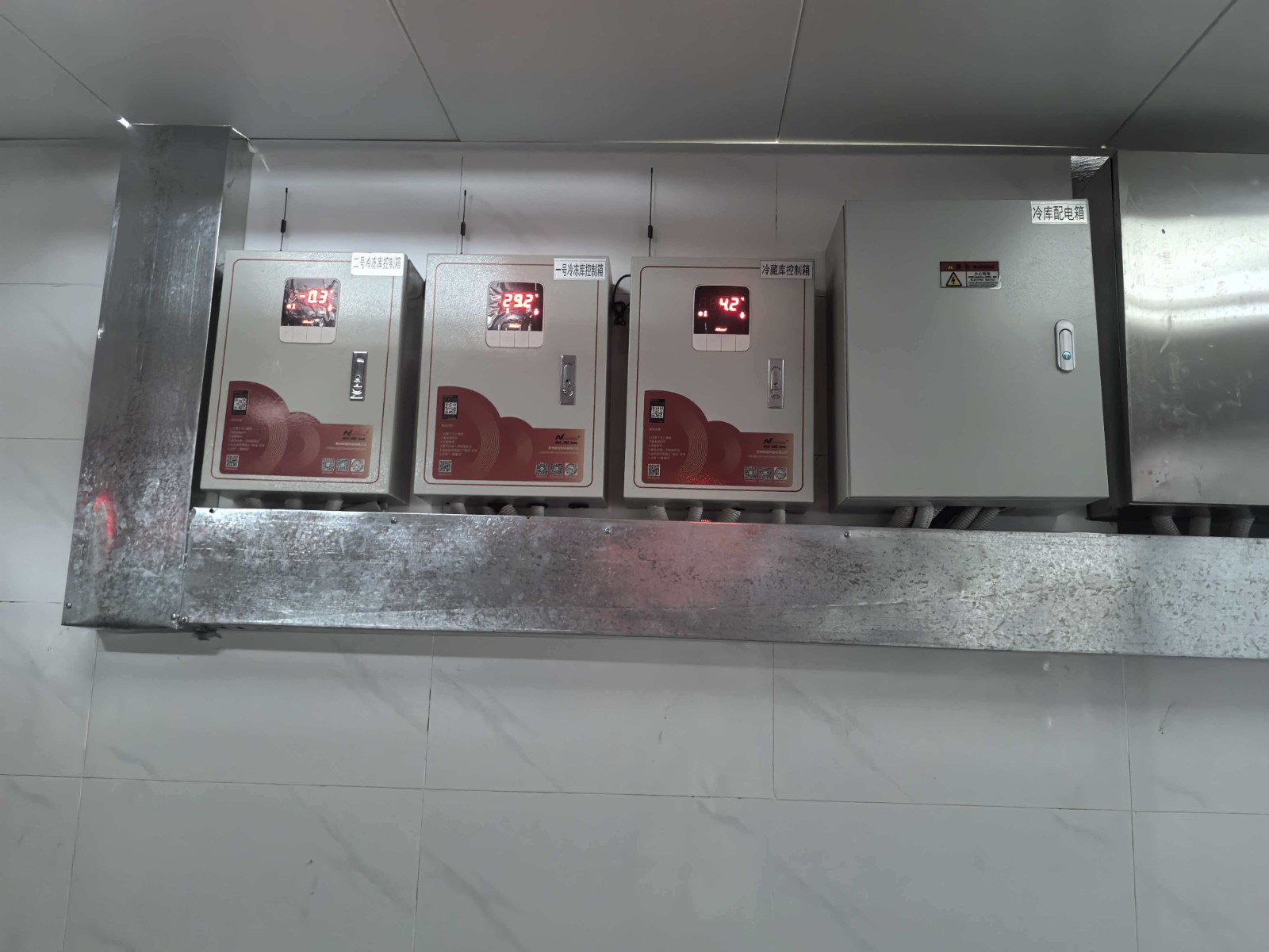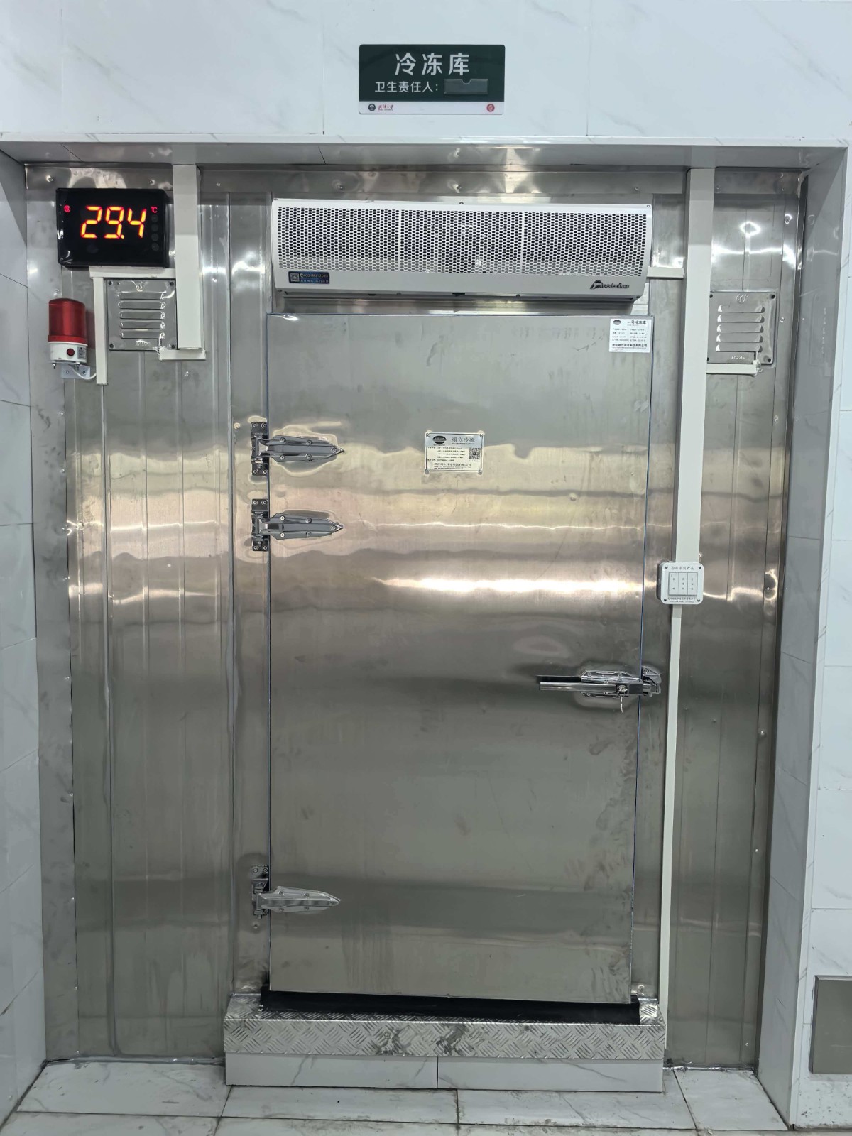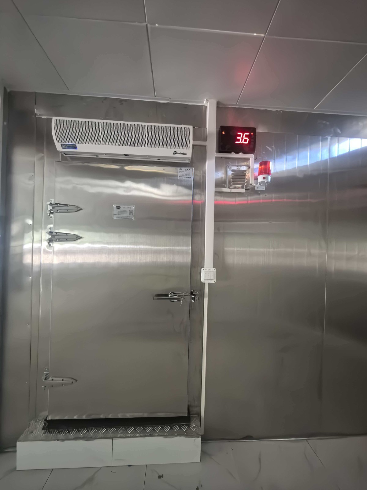 3号冷藏库 | 1.外形尺寸:4.66m*4m *2.5m 2.库温:0~-5℃ | 一、保温配置 1、库体保温:库体保温:150mm厚聚氨酯冷库板,密度40±2kg/m³,双面0.5mm304不锈钢板,B2级阻燃; 2、地面保温:150mm厚聚氨酯冷库板,密度40±2kg/m³,双面0.5mm304不锈钢板,B2级阻燃;上铺3mm厚花纹铝板。 3、0.9*1.8*0.15m双面不锈钢半埋平开门,冷库门锁采用1178型不锈钢材质安全门锁,搭配不锈钢材质高脚锁钩和夜光库门推杆,门框预埋防冻加热丝; 4、库体安装压力平衡装置; 5、门上方安装风幕机; 6、库门上方安装大屏温度显示器 7、冷库配套安装防困紧急呼叫报警器; 二、 ★1、制冷主机:风冷冷凝箱式制冷机组(压缩机机头采用冷冻专用全封闭涡旋压缩机4HP)运行工况:-4℃/+45℃,制冷量:7.42KW,运行功率3.32KW; ★2、冷风机: 型号DD-8.0/40 名义制冷量8KW,换热面积40㎡,电机功率180W*2 ,化霜功率(3.3KW+1.1KW) 风量3675m³*2 材质:304不锈钢材质; ★ 4、物联网控制箱(带手机、电脑远程监控功能)免费提供三年手机监控功能; 5、R404A环保冷媒。 |