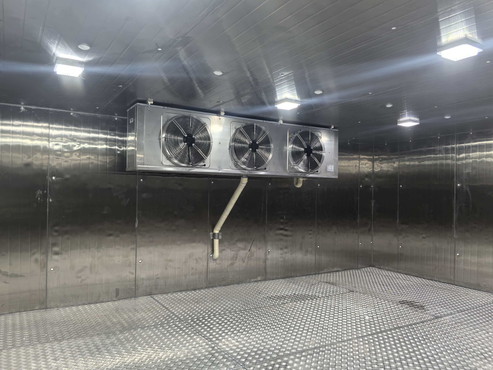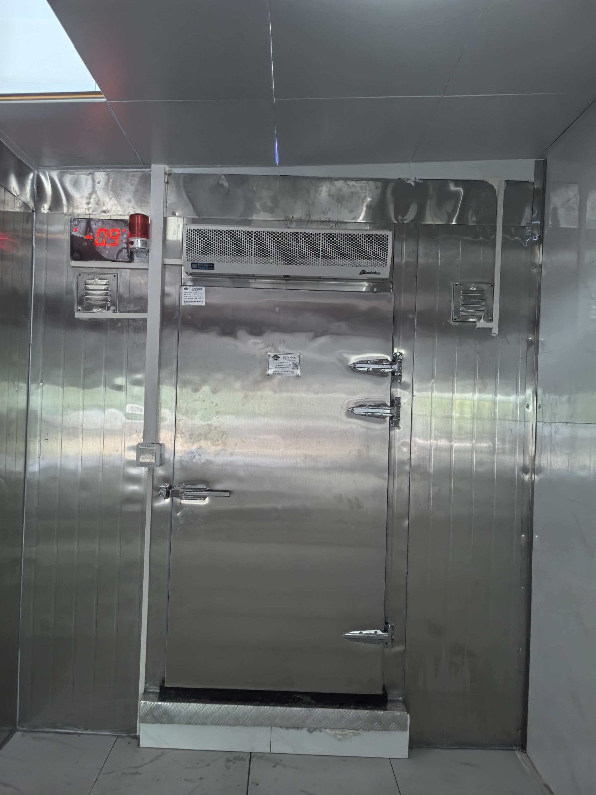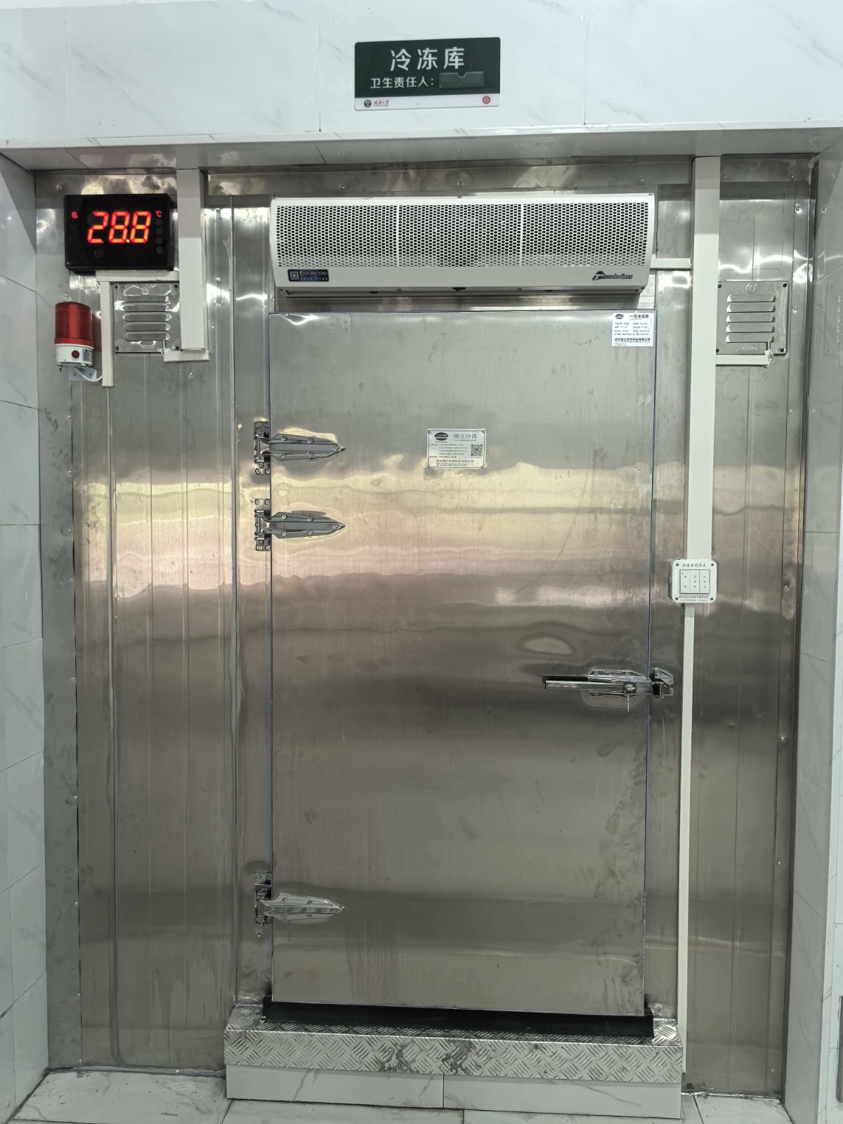 1.外形尺寸:6.66m*4.38m*2.5m 2.库温:-18~-10℃ | 一、保温配置 1、库体保温:库体保温:150mm厚聚氨酯冷库板,密度40±2kg/m³,双面0.5mm304不锈钢板,B2级阻燃; 2、地面保温:150mm厚聚氨酯冷库板,密度40±2kg/m³,双面0.5mm304不锈钢板,B2级阻燃;上铺3mm厚花纹铝板; 3、0.9*1.8*0.15m双面不锈钢半埋平开门,冷库门锁采用1178型不锈钢材质安全门锁,搭配不锈钢材质高脚锁钩和夜光库门推杆,门框预埋防冻加热丝; 4、库体安装压力平衡装置; 5、门上方安装风幕机; 6、库门上方安装大屏温度显示器; 7、冷库配套安装防困紧急呼叫报警器。 二、制冷系统配置 1、制冷主机:风冷冷凝箱式制冷机组(压缩机机头采用冷冻专用全封闭涡旋压缩机12HP,采用喷气增焓节能技术)运行工况:-25℃/+45℃,制冷量:14.05KW,运行功率8.09KW; 2、冷风机: 型号DD-24.0/120 名义制冷量24KW,换热面积120㎡,电机功率414W*3 ,化霜功率(11KW+2.2KW) 风量6765m³*3 材质:304不锈钢材质; 3、热力膨胀阀,名义制冷量26KW,接口尺寸5/8×7/8,提供MOP设计(最大操作压力)、直通型设计、平衡流口设计(BP)、反应滞后程度低、过热度可调、新柱形感温包及固定夹设计、激光焊接,不锈钢感温包及毛细管; 4、物联网控制箱(带手机、电脑远程监控功能)免费提供三年手机&电脑监控功能; 5、R404A环保冷媒。 |