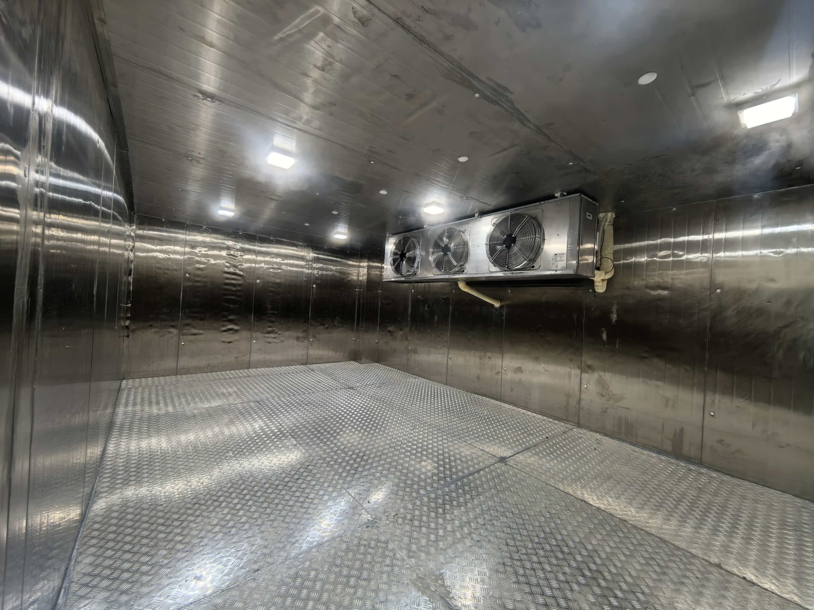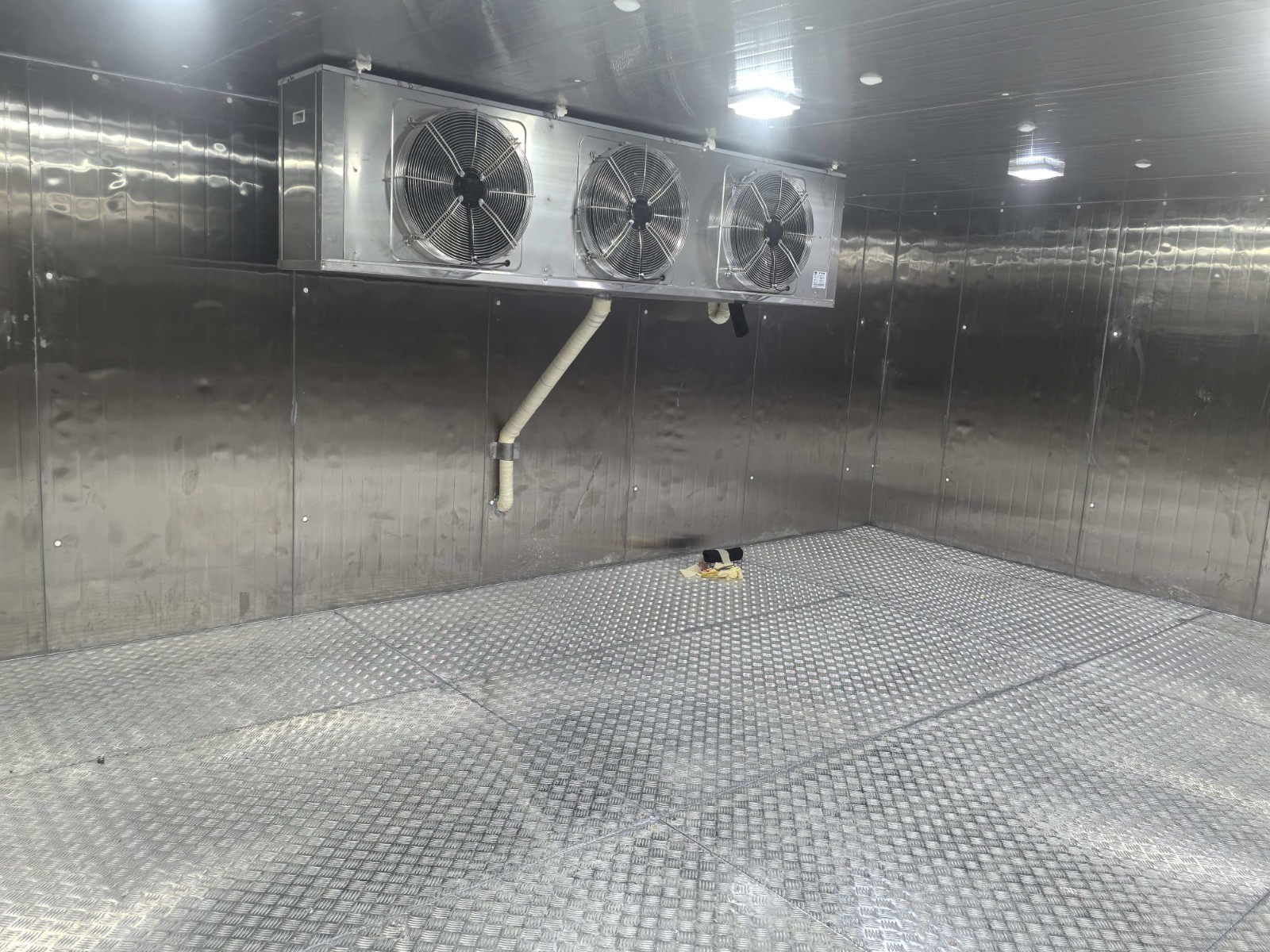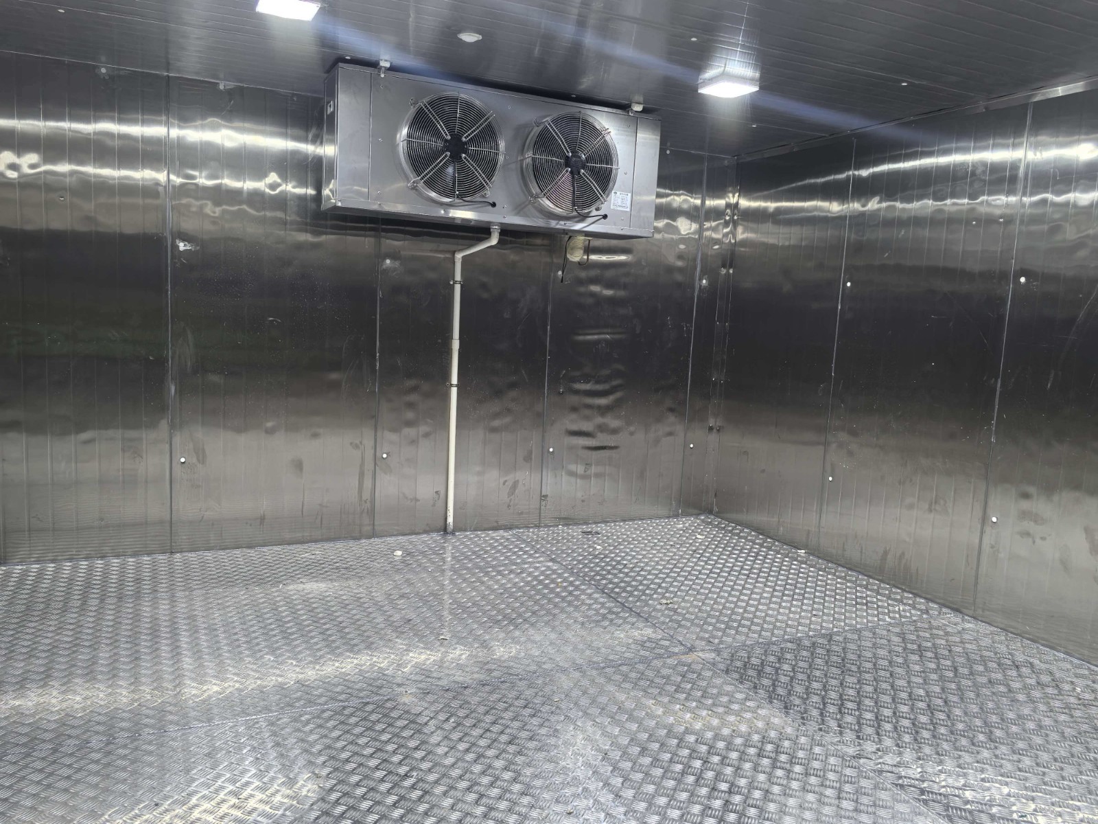 1.外形尺寸:6.66m*4.38m*2.5m 2.库温:-18~-10℃ | 一、保温配置 1、库体保温:库体保温:150mm厚聚氨酯冷库板,密度40±2kg/m³,双面0.5mm304不锈钢板,B2级阻燃; 2、地面保温:150mm厚聚氨酯冷库板,密度40±2kg/m³,双面0.5mm304不锈钢板,B2级阻燃;上铺3mm厚花纹铝板; 3、0.9*1.8*0.15m双面不锈钢半埋平开门,冷库门锁采用1178型不锈钢材质安全门锁,搭配不锈钢材质高脚锁钩和夜光库门推杆,门框预埋防冻加热丝; 4、库体安装压力平衡装置; 5、门上方安装风幕机; 6、库门上方安装大屏温度显示器; 7、冷库配套安装防困紧急呼叫报警器。 二、制冷系统配置 1、制冷主机:风冷冷凝箱式制冷机组(压缩机机头采用冷冻专用全封闭涡旋压缩机12HP,采用喷气增焓节能技术)运行工况:-25℃/+45℃,制冷量:14.05KW,运行功率8.09KW; 2、冷风机: 型号DD-24.0/120 名义制冷量24KW,换热面积120㎡,电机功率414W*3 ,化霜功率(11KW+2.2KW) 风量6765m³*3 材质:304不锈钢材质; 3、热力膨胀阀,名义制冷量26KW,接口尺寸5/8×7/8,提供MOP设计(最大操作压力)、直通型设计、平衡流口设计(BP)、反应滞后程度低、过热度可调、新柱形感温包及固定夹设计、激光焊接,不锈钢感温包及毛细管; 4、物联网控制箱(带手机、电脑远程监控功能)免费提供三年手机&电脑监控功能; 5、R404A环保冷媒。 |